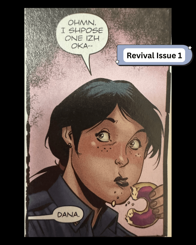 She is indulging her donut craving when her dad, Wayne Cypress, pops up to dispatch her to a call in Wausau, WI. I wasn’t expecting the close-knit superiority, so the body language is fun to read. It starts to tell a story itself. Clearly, there are family secrets. It’s also the first time you get an ideal of Revival Day.