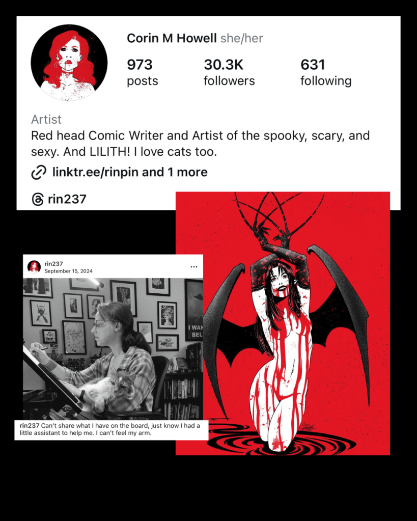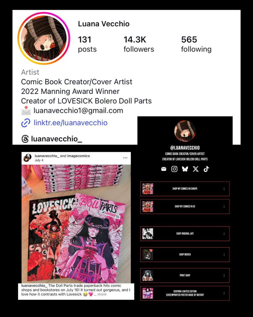 This incredible woman is responsible for some of the best, most graphic horror comics I have ever read. From start to finish, she can do it all. I have written a review about her series Doll Parts, the origin story of Domino from Lovesick. Needless to say I am a huge fan hoping to cross her path one day to get a my covers signed so I can compliment her dedication in person. Her career in the industry is solidified and you would be wise to keep up with it. She is rapidly expanding her audience and creating beautiful pieces to buy for your collection. She takes commissions and has merch you can order through the link in her bio on Instagram.